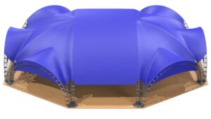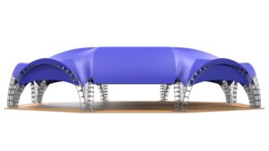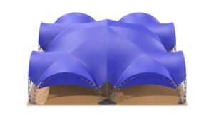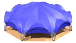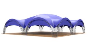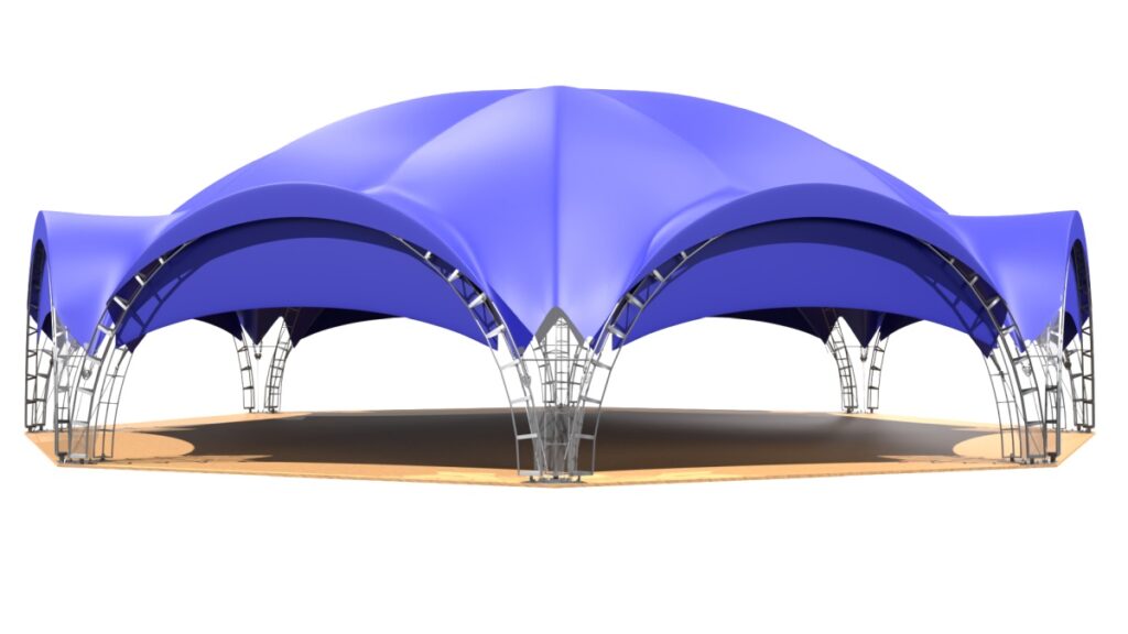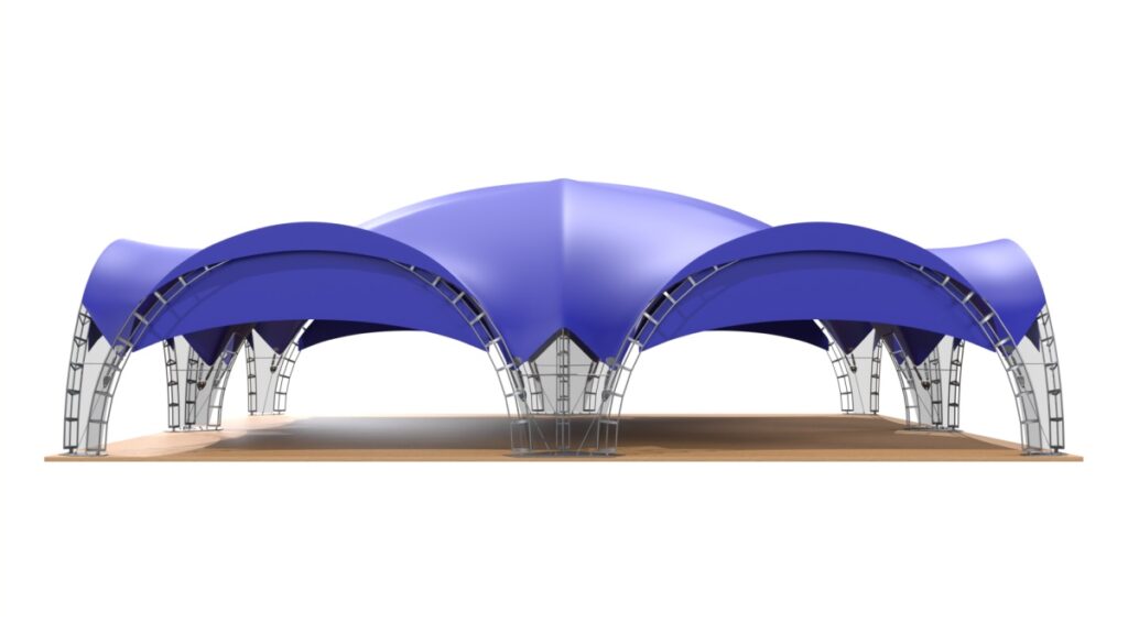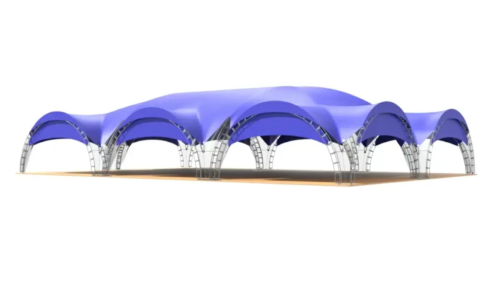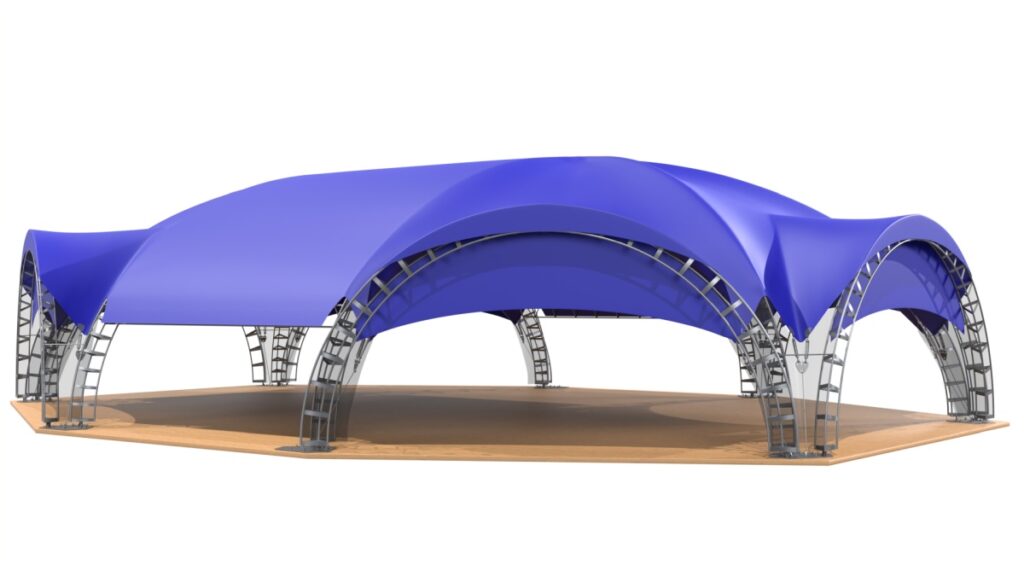 Арочный шатер собирается из металлических арок, которые надежно закрепляются в земле или иной основе. На округлые арки натягивается тент. Шатровые сборно-модульные конструкции бывают разных форм – от одинарной арки до гексагонального шатра, состоящего из 10 опор. Можно соединить несколько шатров в один, получая навес нужной формы и размера.