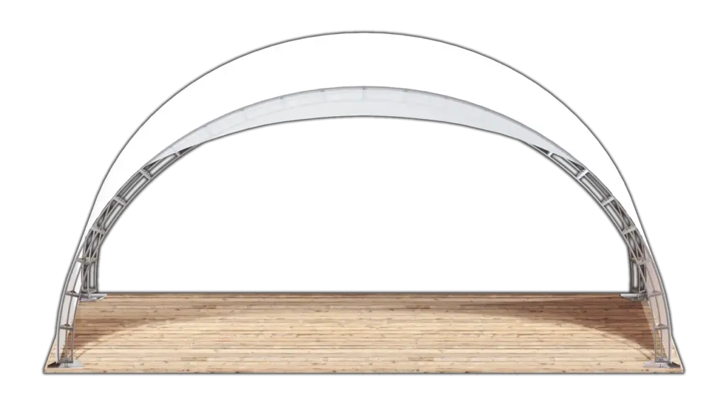 Арочные шатры используют круглый год. Их можно утеплить, дополнить стенками, установить входную группу с дверью. Арки становятся основой для подвешивания осветительного, светомузыкального оборудования. Каркас можно скрыть, задрапировав тканями, цветочными гирляндами, прочим декором. Внутри устанавливаются полы, выдерживающие мебель и большой поток посетителей.