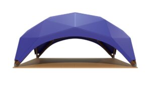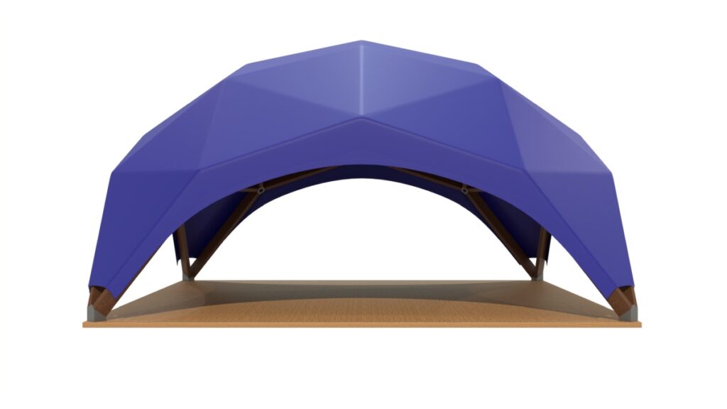 Шатры из дерева или иначе окто-купола – это временные навесы в форме квадросферы. Основные элементы каркаса — деревянные бруски, они соединяются между собой таким образом, что получаются равнобедренные треугольники. Для фиксации используется стальной крепеж, покрытый антикоррозийным составом. Сверху на каркас натягивают плотное полотно, оно может быть прозрачным и непрозрачным, цветным.